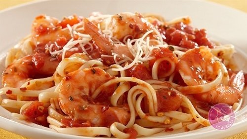 تحضر حلة لوضع باقى البصل والثوم في كمية زيت مناسبة، وتوضع صلصة الطماطم وعصير الطماطم، وتترك حتى تغلى، ثم نضع المكرونة المسلوقة، ونغرف مكرونة، وفوقها الجمبرى مع رشة البقدونس، وألف هنا.