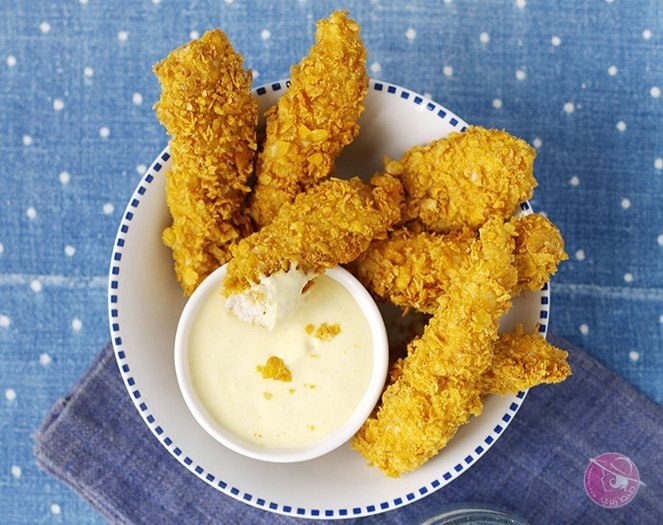 3. تُلتّ شرائط الدجاج بالدقيق، ثم تُغمّس بالبيض، وأخيرًا بالـ”كورن فليكس”.