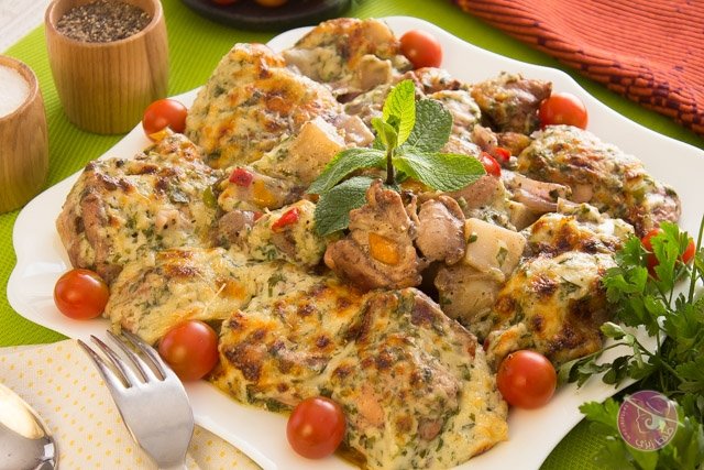- نحضر صينية فرن وننقل بها قطع الدجاج ويصب فوقها البشاميل ونرش الوجه بالجبنة الشيدر