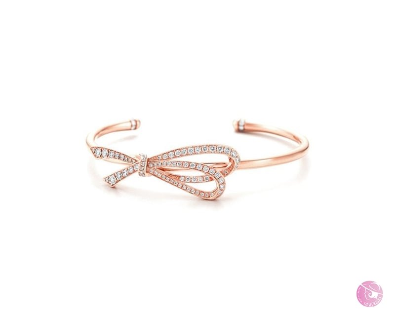 أحدث إبتكاراتي تيفاني آند كو الأنثوية، سوار الفيونكة بالذهب الوردي والمطعم بالألماس، ويتوفر منه القلادة والأقراط أيضاً.