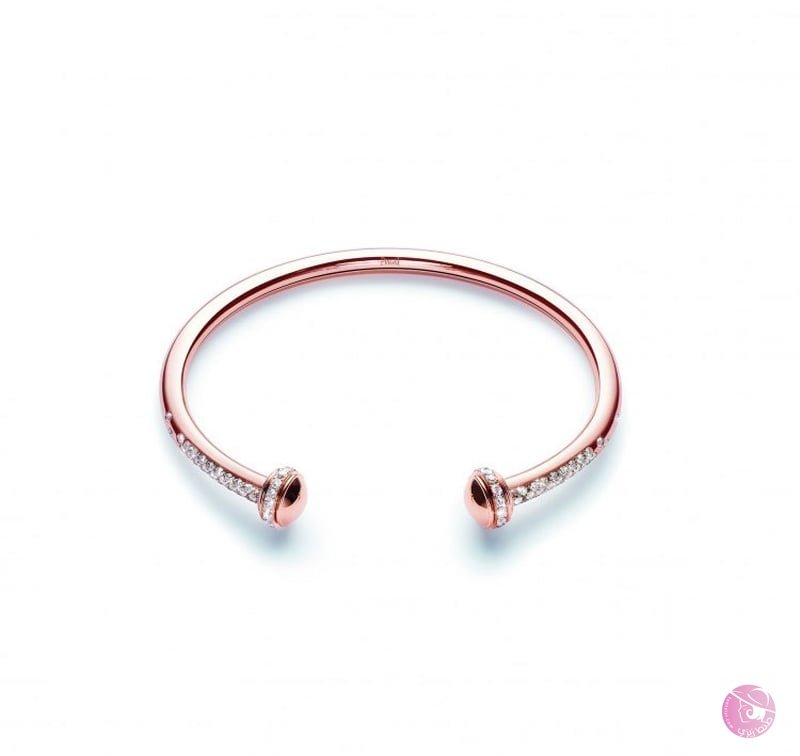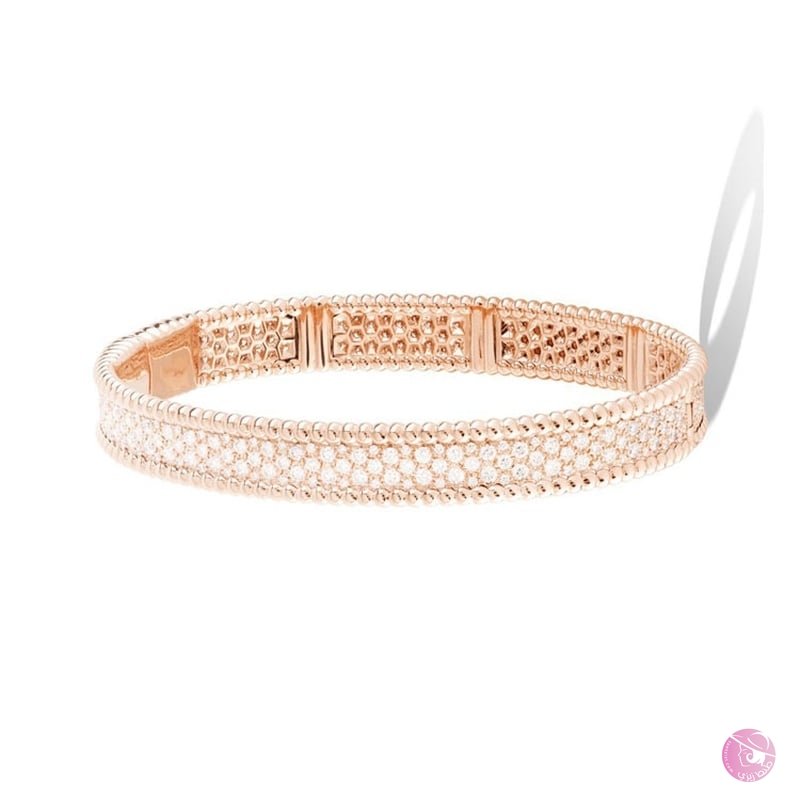 سوار ناعم ويتميز بتصميم البسيط والراقي في الوقت نفسه، مرصع بالألماس على الأطراف وهو من توقيع بياجيه Piaget.