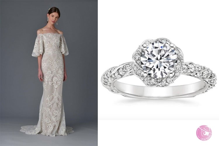 تلك الصيحة التي لا يمكن أن يتخلى عنها مصممو فساتين الزفاف، الورود التي تزين الفساتين، ولكن لكل مصمم لمسته الخاصة، وهنا نرى فستان مزين بالورود من نعيم خان Naeem khan، والذي يمكن تنسيقه مع خاتم زفاف ألماس بتصميم زهرة اللوتس