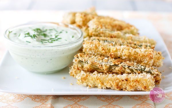7. وفي الوقت نفسه، لصنع الغموس، يخلط ما تبقى من جبن البارميزان واللبن والريحان والمايونيز والثوم والفلفل الأسود في وعاء معالج الطعام حتى تخلط بشكل جيد. تخرج الكوسا من الفرن إلى سلك التبريد وتقدم الكوسا مع الغموس.