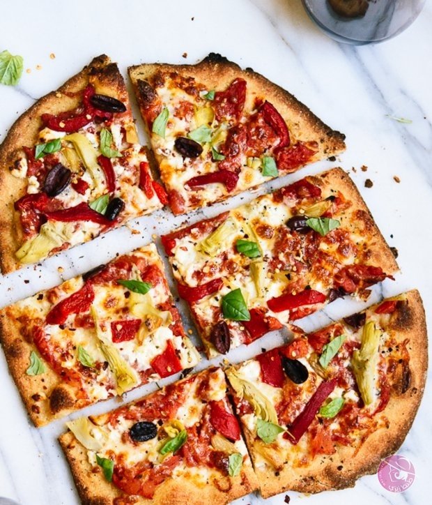 -قسمي البيتزا إلى قسمين وضعي جبنة الموزاريلا والفلفل المشوي الأحمر، الخرشوف والزيتون وأخيراً جبنة الفيتا.