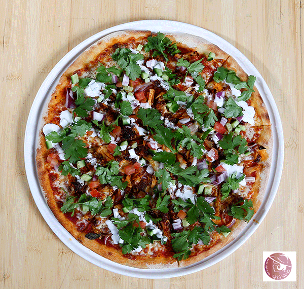 4. عند التقديم: أخرجي البيتزا من الفرن وأضيفي لها الزبادي، وجبنة الـفيتا والخيار والبندورة. ووزّعي الكزبرة عليها.
