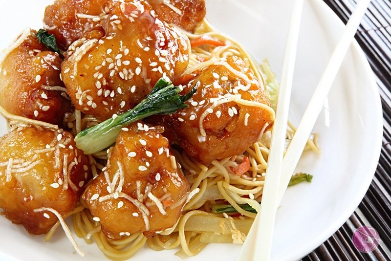 5. ضعي الدجاج في طبق التقديم و صبي الصوص فوق الدجاج و انثري السمسم فوقه قدميه إلى جانب النودلز أو الأرز الأبيض.