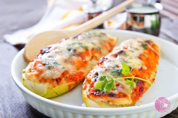 اخرجي شرائح الكوسا ن الفرن ثم وزعي عليها صلصة البيتزا وجبن الموتزريلا.
