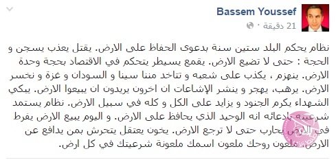 من جانبه علّق الإعلامي الساخر باسم يوسف، عبر تدوينة خلال صفحته الرسمية على موقع التواصل الاجتماعي “فيسبوك”: “نظام يحكم البلد ستين سنة بدعوى الحفاظ على الأرض.. يقتل يعذب يسجن والحجة حتى لا تضيع الأرض.. يقمع يسيطر يتحكم في الاقتصاد بحجة وحدة الأرض”.