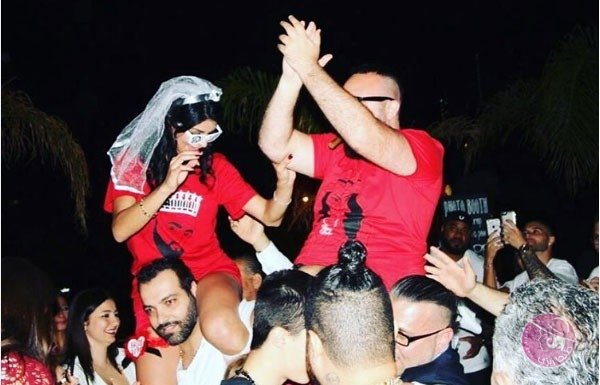 ملكة جمال أمريكا السابقة ظهرت في صورة أخرى وهي ترتدي طرحة الزفاف البيضاء وبجوارها حبيبها، وهما محمولين على الأعناق.
