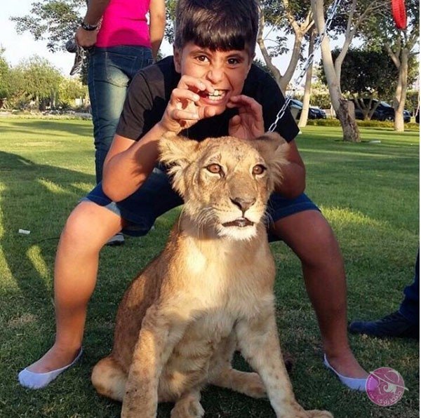 ابن الفنان المصري ظهر في إحدى الصور وهو يلف ثعبان ضخم حول رقبته، فيما ظهر في صورة أخرى وهو يلعب مع شبل.