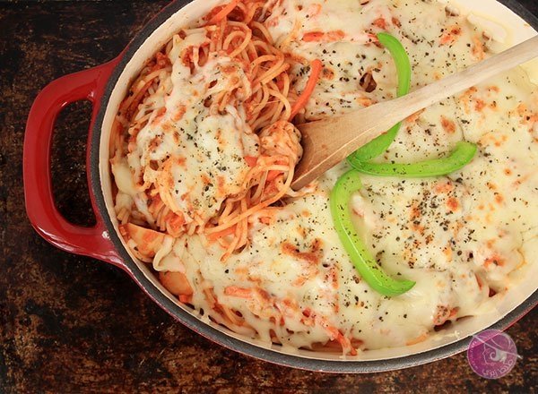 4. يوضع نصف خليط السباغيتي في طبق خبيز مدهون بسمن أو زيت. ومن ثم يوضع فوقه نصف كمية الجبن وصلصة اللحم وجبن الموزاريلا. ويكرر وضعها في طبقات.