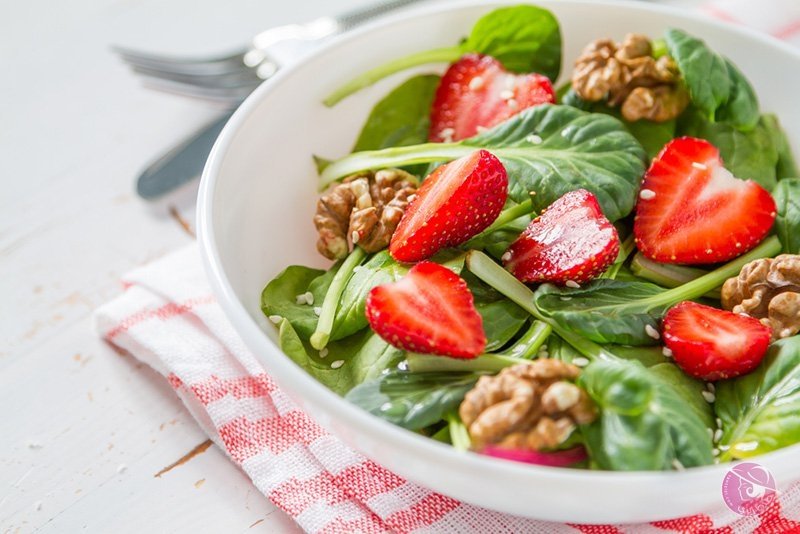 3. ضعي الخس والفراولة و البصل فوق النودلز.