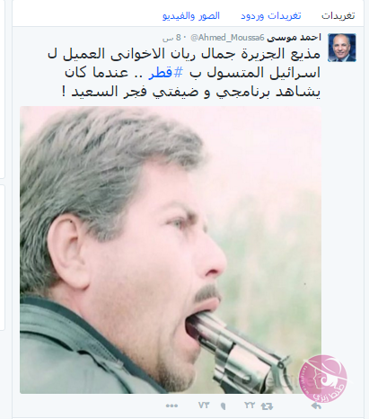 وقال موسى، في تغريدة على حسابه الشخصي بموقع التواصل الاجتماعي “تويتر”: “مذيع الجزيرة جمال ريان الإخوانى العميل لإسرائيل المتسول ب #قطر.. عندما كان يشاهد برنامجي و ضيفتي فجر السعيد”.