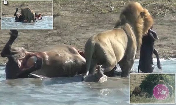 أسد يجري عملية قيصرية لجاموسة ليخرج جنينها ويأكله