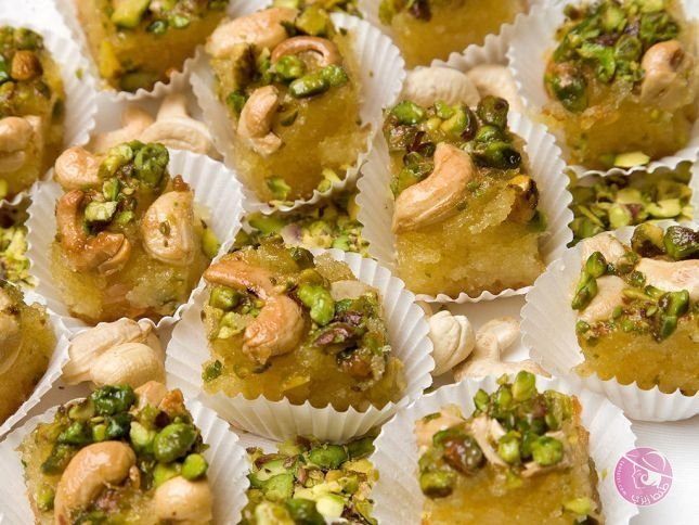 2. يقلّب هذا المزيج مجدّداً حتى يتجانس، ثمّ ينقل إلى صينيّة مدهونة بالطحينة. يُنثر فوقه الفستق الحلبيّ والكاجو.