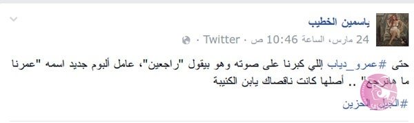 ياسمين سبت عمرو دياب في تدوينة لها، على حسابها الخاص على موقع «الفيس بوك»: «حتى عمرو_دياب اللي كبرنا على صوته وهو بيقول “راجعين”، عامل ألبوم جديد اسمه “عمرنا ما هانرجع” .. أصلها كانت ناقصاك يابن الكئيبة».