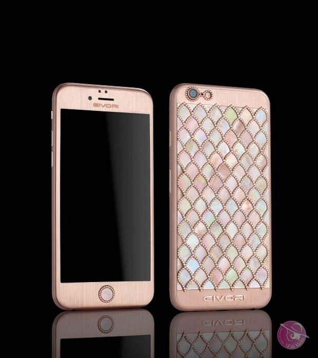 أو العقيق، وذلك ضمن نماذج وأشكال مذهلة من الأسماك، والتي جرى تطعيمها بدقة بالغة ضمن شبكة ذهبية تمتد على كامل الغلاف الخلفي للجهاز. وتم ترصيع هذا التصميم بقطع الألماس عالية الجودة في الإصدار الخاص لمجموعة «كاليبسو الماسية».